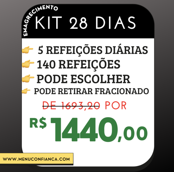 •O que inclui: O kit é planejado para 28 dias e acompanha 5 refeições diárias para cada um desses dias.